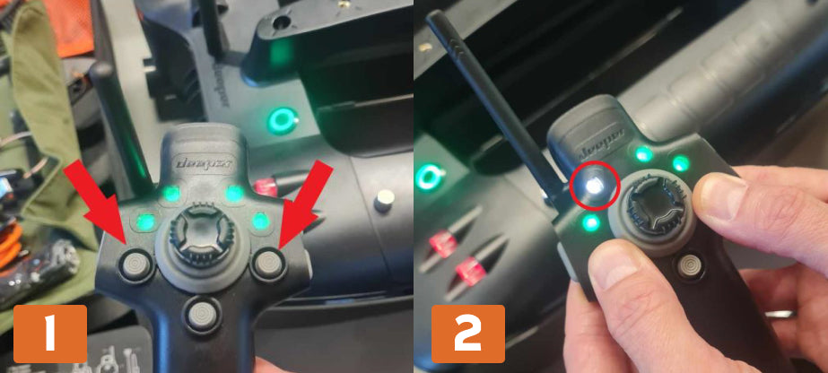 - Halte die linken und rechten Klappenknöpfe gleichzeitig gedrückt, bis die LED-Leuchten des Bootes weiß blinken (siehe Bilder).